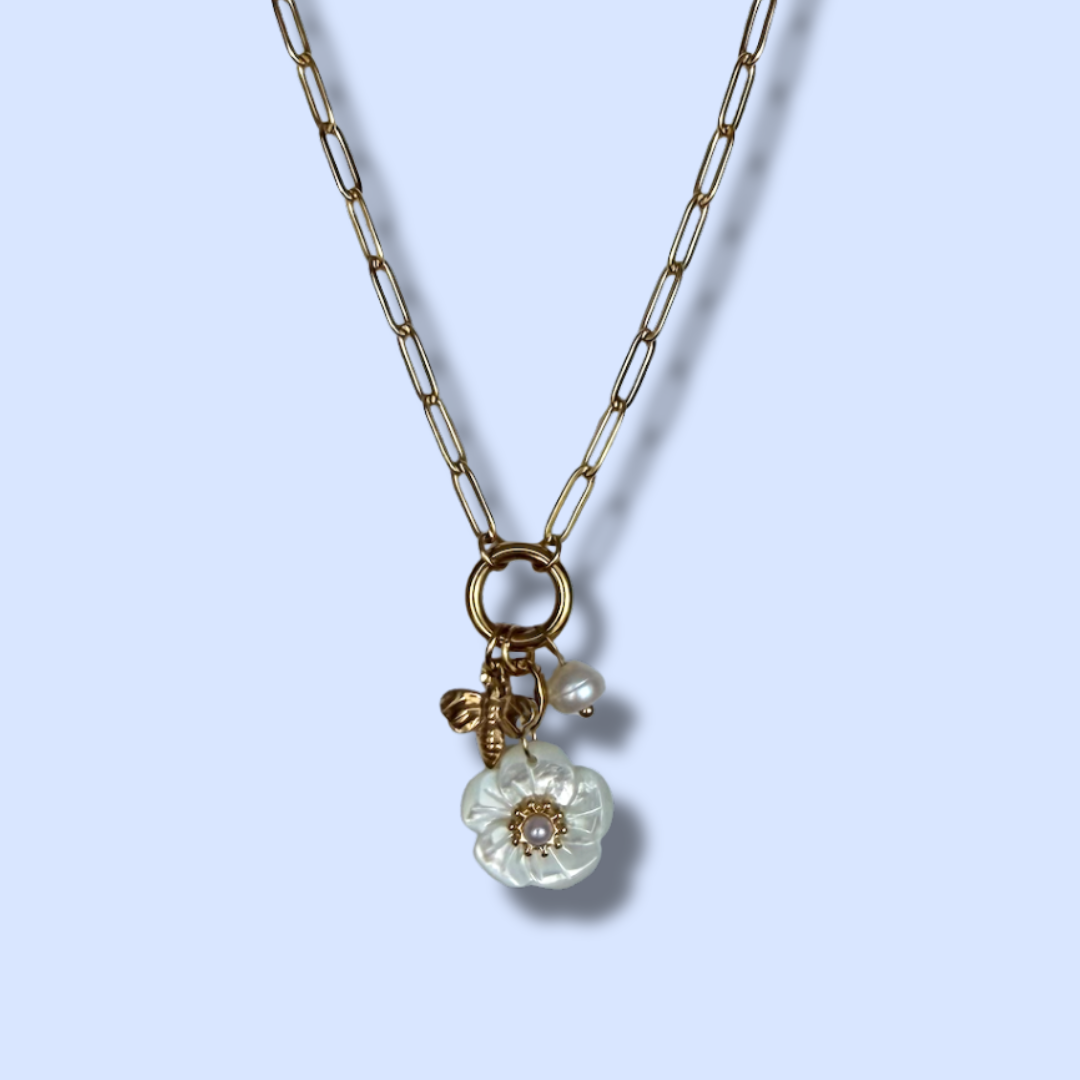 - Collier en acier inoxydable (fleur nacrée, perle d'eau douce)